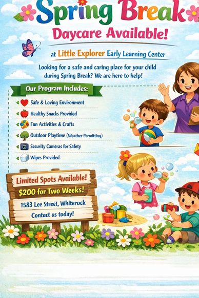 Spots are limited, so don’t wait—secure your child’s place today and let them enjoy a Spring Break full of laughter, play, and discovery!
